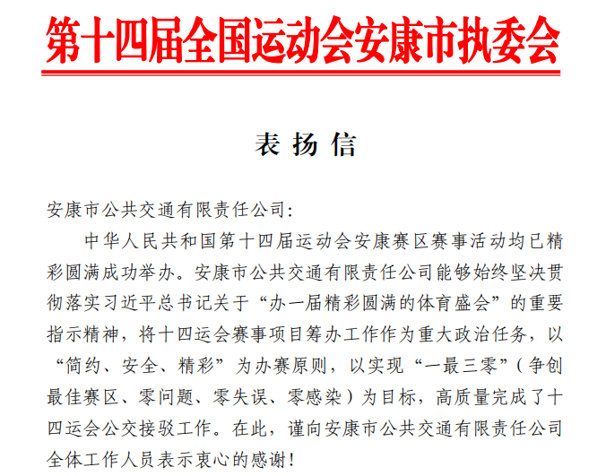 近日,第十四屆全國運動會安康市執委會向市公交公司發來表揚信,對公交公司高質量完成十四運會公交接駁工作表示感謝。