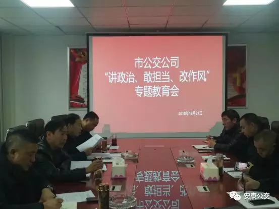 12月24日上午,市公交公司黨委召開“講政治、敢擔當、改作風”專題教育會,黨委書記、董事長張曉強主持會議并講話,公司黨政領導班子成員參加會議,中層以上干部列席會議。會議傳達學習了市國資委《關于在全市工信(國資)系統領導干部中開展“講政治、敢擔當、改作風”專題教育實施方案》、市紀委《關于集中開展違規收送禮金問題專項整治的工作方案》《關于集中整治形式主義、官僚主義的工作安排》等文件。